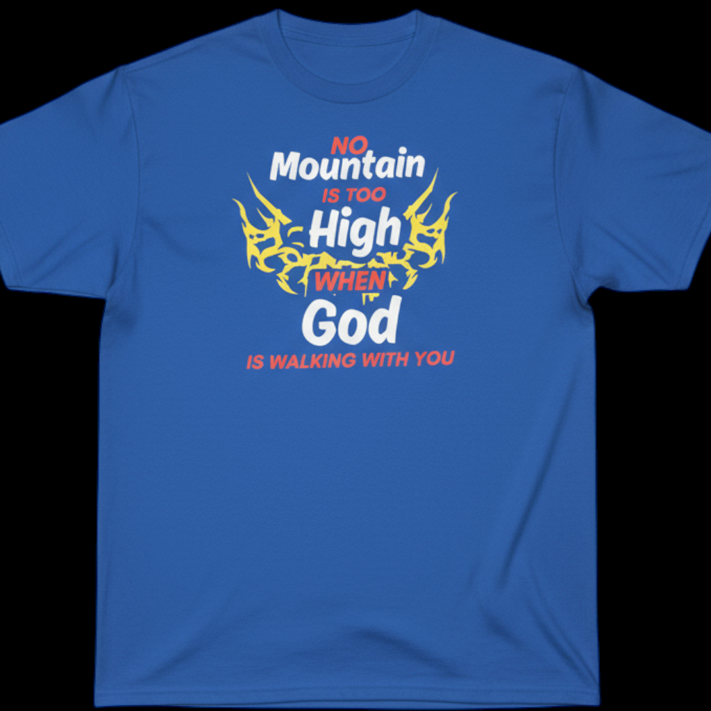 Life throws high peaks and steep challenges our way, but with this inspiring t-shirt, you carry a constant reminder of the ultimate truth: "No mountain is too high when God is walking with you."